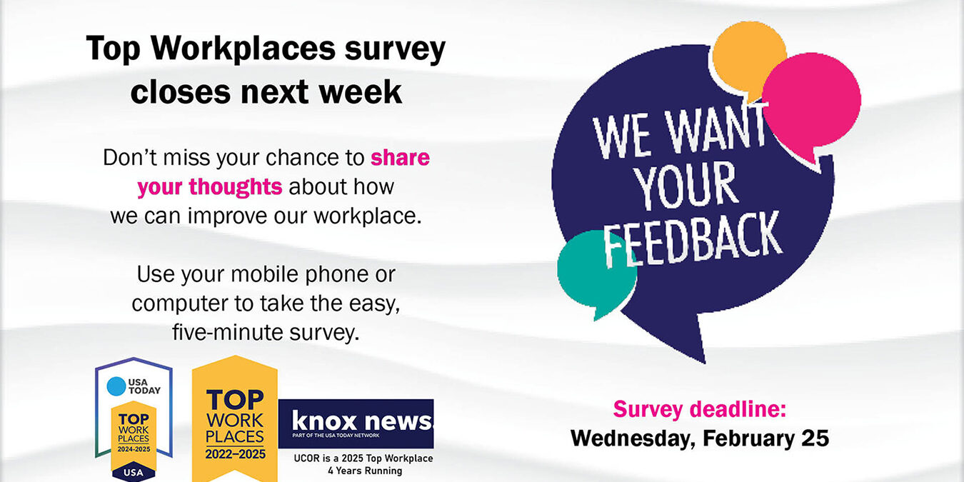 We are almost halfway through the Top Workplaces survey period. Our response rate goal is 60%. Today we are at 33%. If you haven’t taken your survey yet, please do that today. We want to hear from you! This is your chance to share what you think about working at UCOR. Your feedback helps us make our workplace even better.
